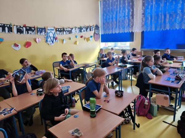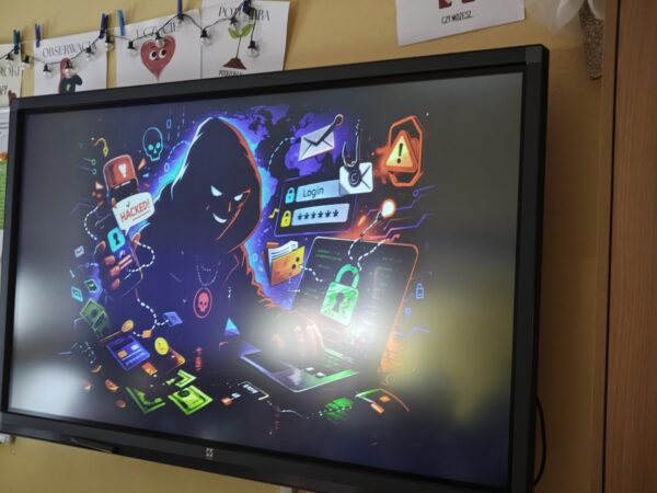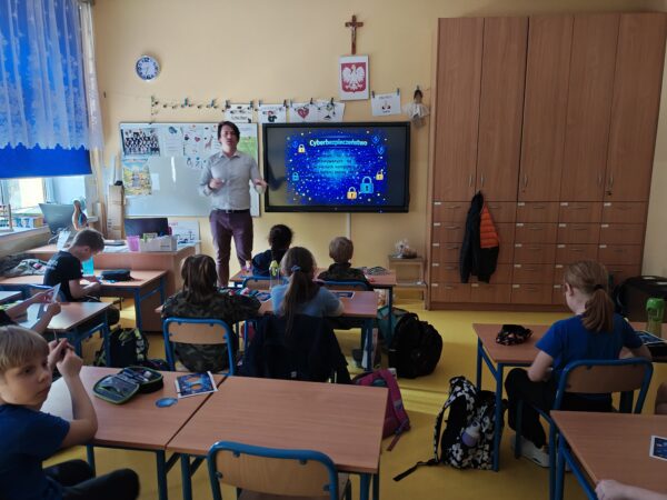 W klasie 2 odbyła się wyjątkowa lekcja o cyberbezpieczeństwie, którą poprowadził rodzic jednego z uczniów – tata Kajetana, pan Bartosz. Dzieci z dużym zaangażowaniem odpowiadały na ciekawe pytania i aktywnie uczestniczyły w zajęciach. Poznały pojęcie kryptografii oraz dowiedziały się, na czym polega szyfrowanie informacji. W praktycznej części zajęć uczniowie szyfrowali swoje imiona przy użyciu kreatywnych pomocy dydaktycznych. Na zakończenie mieli okazję zobaczyć, jak szybko podobne operacje wykonuje komputer. Była to inspirująca i pełna odkryć lekcja, która rozbudziła ciekawość dzieci w świecie nowych technologii. Uczniowie z niecierpliwością wyczekują kolejnej wizyty pana Bartosza. Serdecznie dziękujemy.