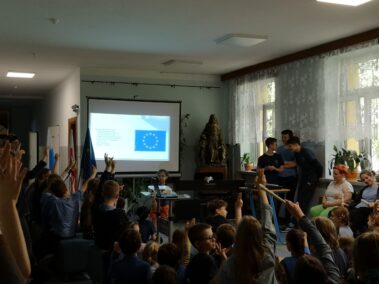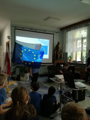 Uczniowie klasy VIII (Jacek Lorkowski, Adrian Czajka, Michał Krząstek oraz Mateusz Job) pod opieką nauczyciela wiedzy o społeczeństwie, pana Bartosza Dudasza, przygotowali prezentację multimedialną oraz prelekcję na temat początków Unii Europejskiej, jej symboli, organów, państw członkowskich oraz programów Unii Europejskiej. Poważne i złożone zagadnienia zaprezentowali w przystępnej i łatwo zrozumiałej dla młodego słuchacza formie, a zaangażowanie audytorium dodatkowo zwiększył końcowy quiz z cukierkami.