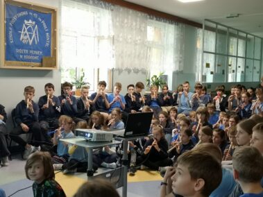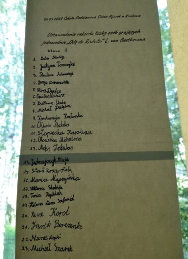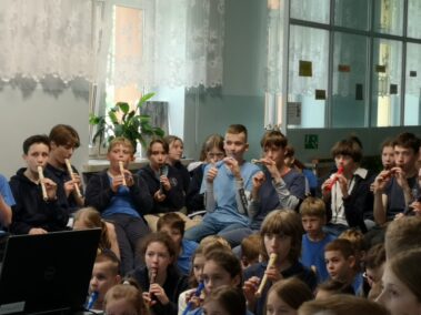 To spotkanie było też okazją do ustanowienia szkolnego rekordu w największej liczbie osób grających na flecie “Odę do radości”, hymn Unii Europejskiej. Już od klasy I uczniowie pod okiem p. Marzeny Ciuraby-Gałki zgłębiają tajniki nutek, rytmu i melodii, a w późniejszych latach uczą się gry na flecie prostym. Na szkolnym korytarzu zgromadziło się aż 71 młodych flecistów, którzy wspólnie, z przejęciem i oddaniem, zagrali fragment IX symfonii Beethovena. Gratulacje! A za rok… próba bicia szkolnego rekordu 🙂