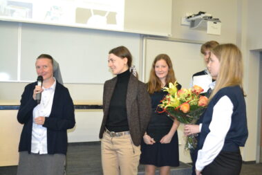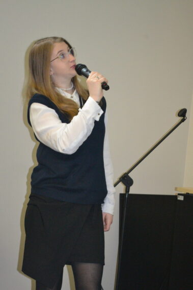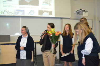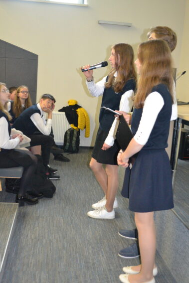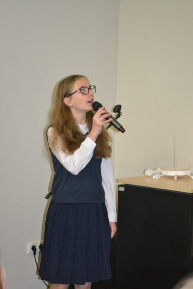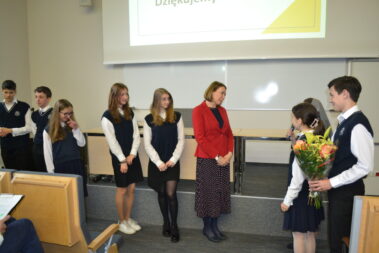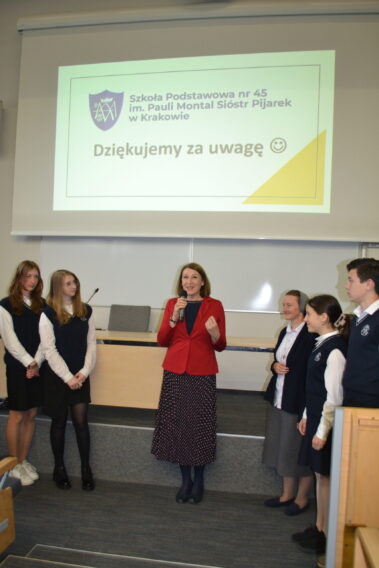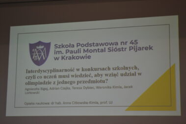 Uczniowie w oparciu o przygotowane wcześniej prezentacje omówili zagadnienia dotyczące interdyscyplinarności w konkursach szkolnych. Opiekunem naukowym występującej młodzieży jest Pani dr hab. Anna Citkowska-Kimla, pracownik Uniwersytetu Jagiellońskiego.