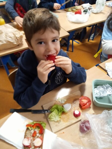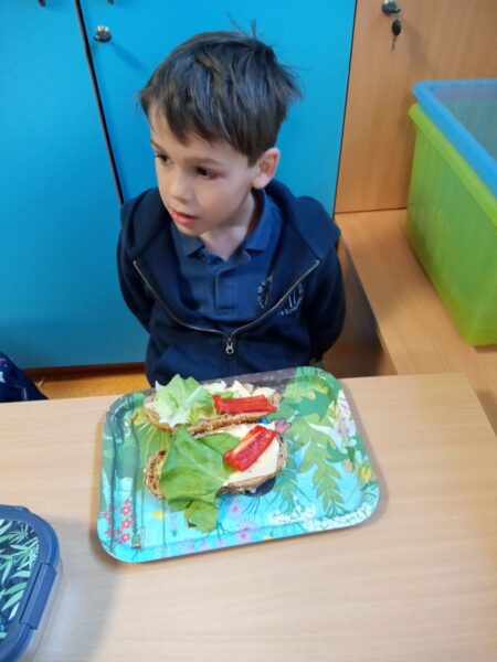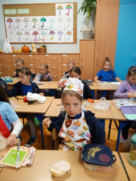 W miesiącu październik uczniowie klasy I poznawali na zajęciach zawód kucharza, zasady prawidłowego komponowania posiłków. Wykorzystując zdobytą wiedzę, sami zamienili się w małych kucharzy i postanowili przygotować zdrowe, klasowe śniadanie. Kroili, smarowali, układali, a na końcu z apetytem konsumowali przygotowane kanapki. Ponad to uczniowie przypomnieli sobie podstawowe zasady higieny, bezpieczeństwa oraz kulturalnego zachowania się przy stole. Efekty naszej pracy można podziwiać w galerii zdjęć.