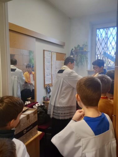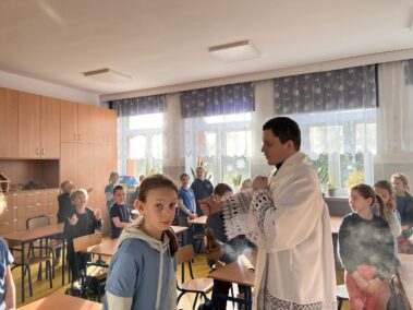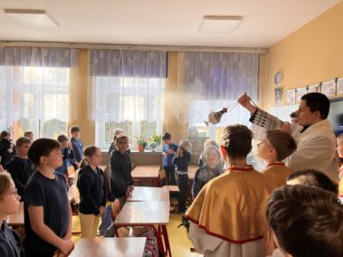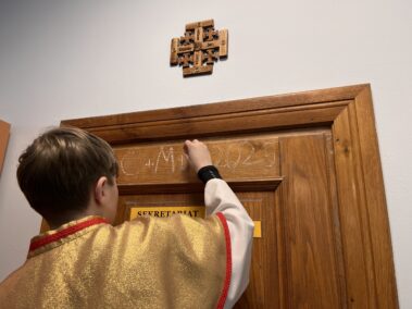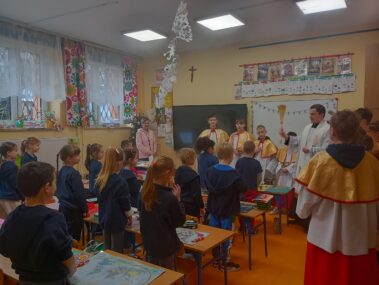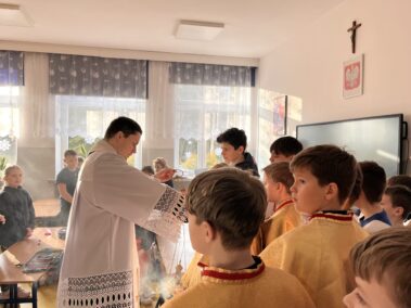 Po zakończeniu modlitwy o. Rafał SP wraz z ministrantami rozpoczął obchód wszystkich klas i pomieszczeń szkolnych. Przy śpiewie tradycyjnych polskich kolęd kapłan poświęcił każdą przestrzeń, życząc uczniom i nauczycielom obfitości Bożego błogosławieństwa w rozpoczętym roku. Każde spotkanie w klasie było okazją do krótkiej rozmowy i wyrażenia wzajemnej życzliwości. Ministranci opisali kredą drzwi naszych klas.
