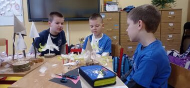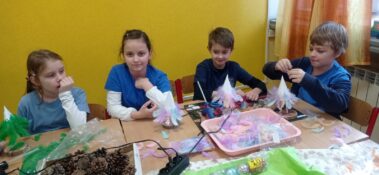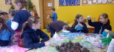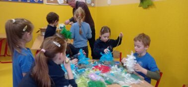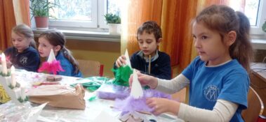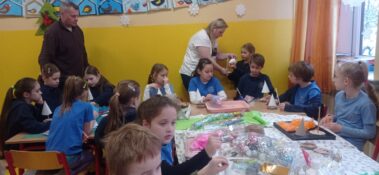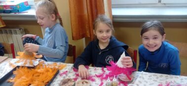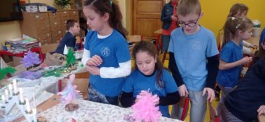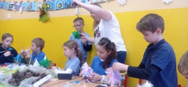 Przygotowując się do Świat Bożego Narodzenia uczniowie klasy drugiej wzięli udział w ciekawych warsztatach plastycznych prowadzonych przez p. Renatę Słopiecką- mamę Karoliny, która z wielkim zaangażowaniem wyjaśniała zasady tworzenia choinek, służyła radą i pomocą,. W czasie zajęć dzieci wykonały piękne dekoracje świąteczne. Państwo Słopieccy obdarowali drugoklasistów wszelkimi potrzebnymi materiałami, więc w klasie zrobiło się kolorowo od różnobarwnych piór, bombek i łańcuchów. Zajęcia dostarczyły drugoklasistom wiele radości i co najważniejsze, dzieci mogły zabrać swoje prace, aby piękne choinki stanowiły ozdobę ich domów.