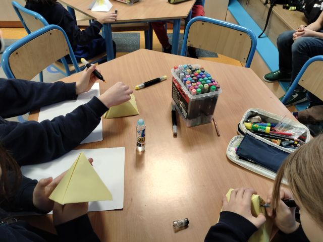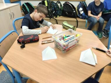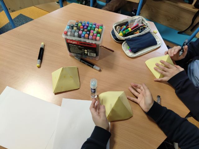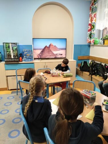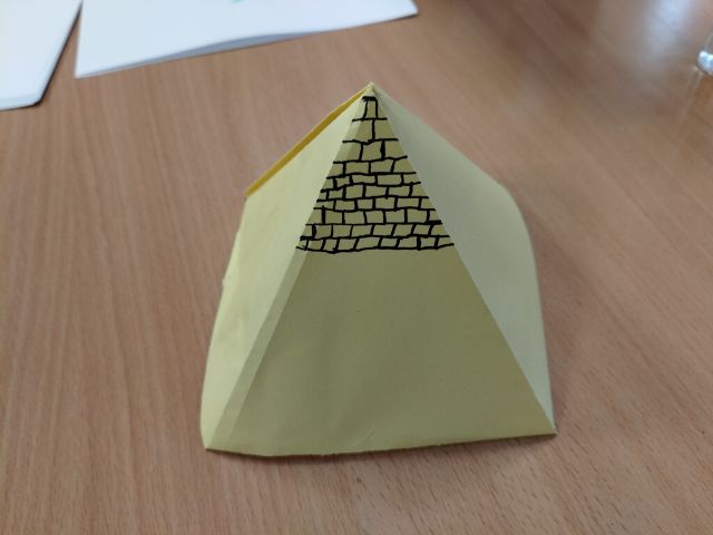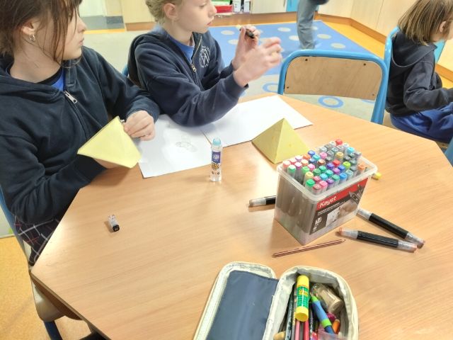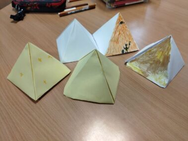 Jako zadanie do wykonania w ramach realizowanego w czasie zajęć świetlicowych projektu „Zabawa sztuką” wybraliśmy temat “Piramidy”. Uczniowie poznali historię piramid, a następnie zbudowali własne przy użyciu pudełek zrobionych z kartek A4. Kolorowe kartki papieru, wykorzystując sztukę origami, zamieniły się w małe piramidy, ozdobione kolorowymi flamastrami.