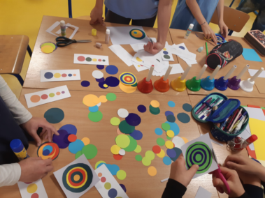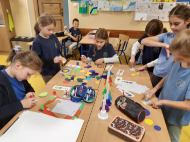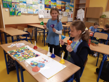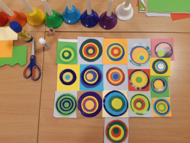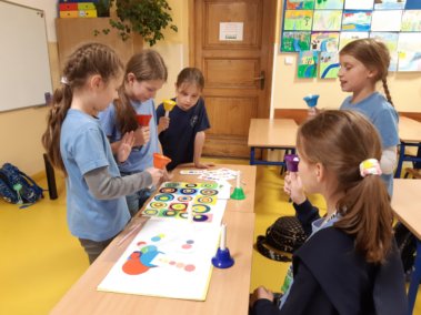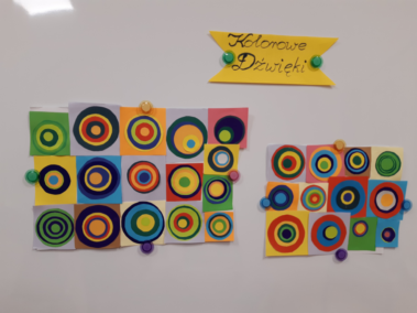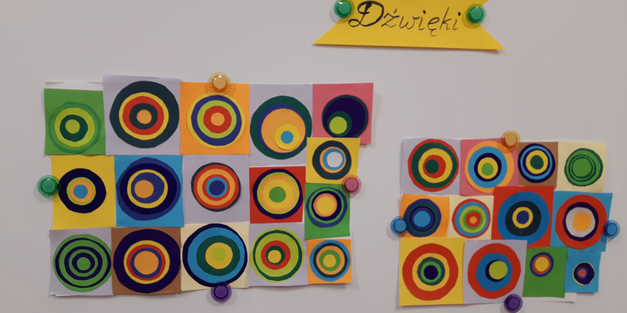 Na zajęciach świetlicowych rozpoczęliśmy realizację projektu edukacyjnego „Zabawa sztuką”. Uczniowie klasy III świetnie się bawili tworząc „Kolorowe dźwięki”. Wykorzystując kolorowe koła wycięte z papieru odtworzyli obraz Kandinsky’ego „Studium koloru: Kwadraty z koncentrycznymi okręgami”. Następnie przy pomocy dzwonków diatonicznych sprawdzali, jak brzmi wykonane dzieło. „Kolor i rytm”, „Kołowa loteryjka” oraz „Wyścig kolorów” to zabawy, w których chętnie brali udział nie tylko trzecioklasiści, ale także ich młodsi koledzy.