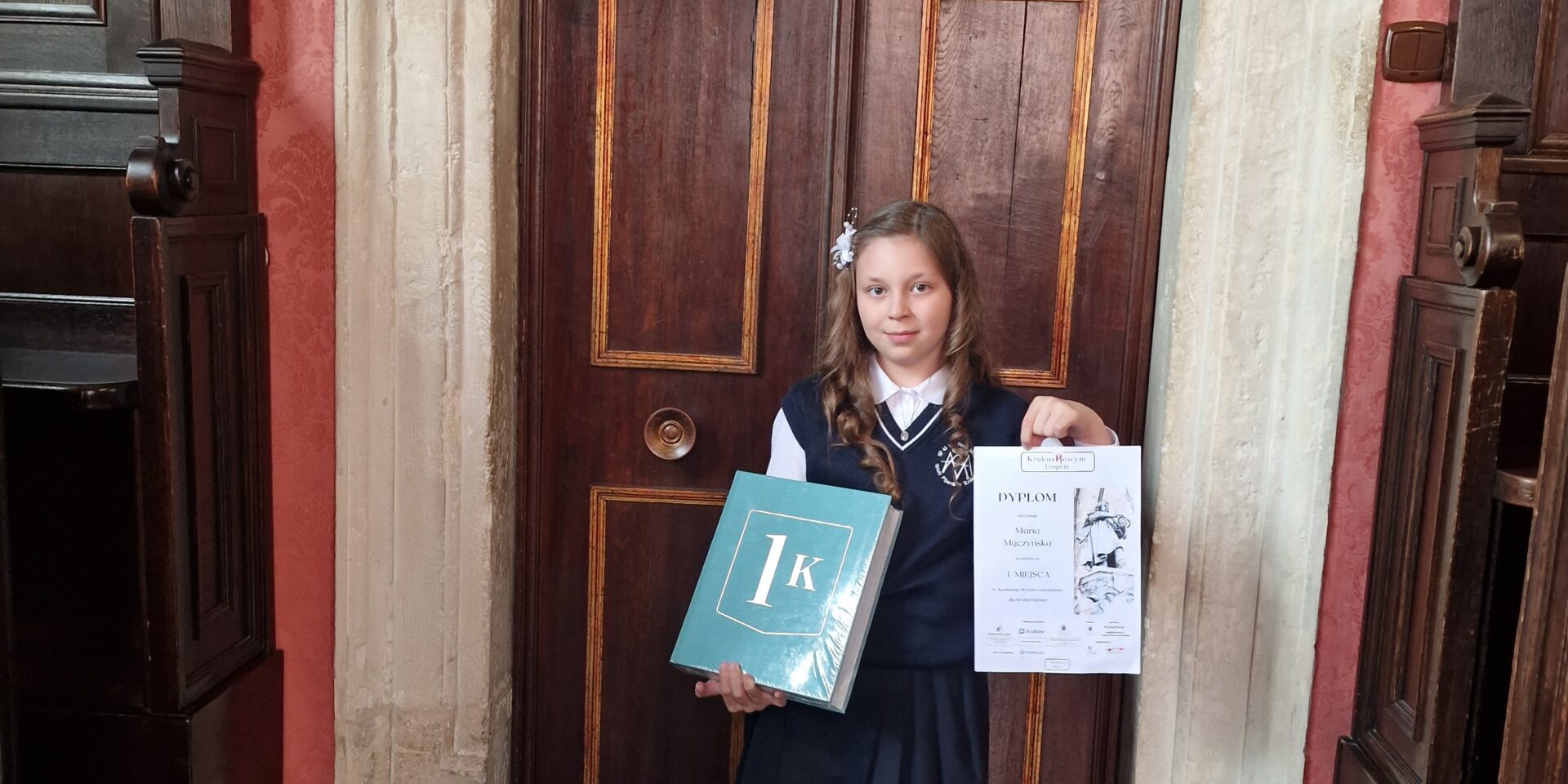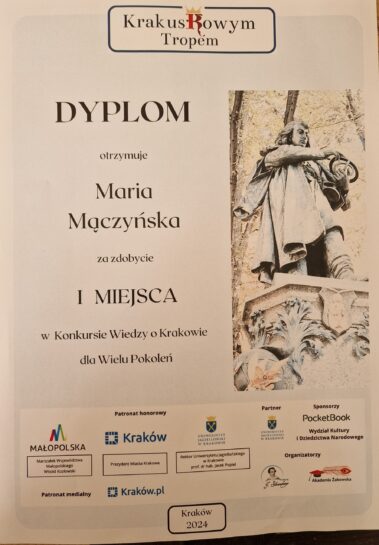 Maria Mączyńska uczennica klasy III została laureatką I miejsca w Konkursie „ Krakuskowym Tropem- konkurs wiedzy o Krakowie dla wielu pokoleń” pod hasłem „Mikołaj Kopernik w Krakowie”, w którym co roku biorą udział uczniowie klas trzecich z ponad 100 szkół w Krakowa i okolic.