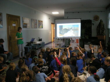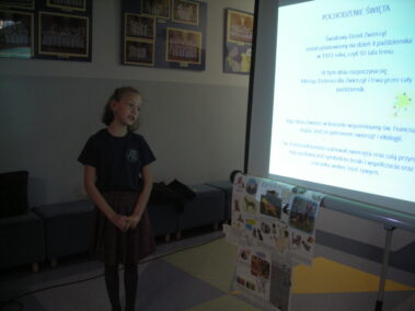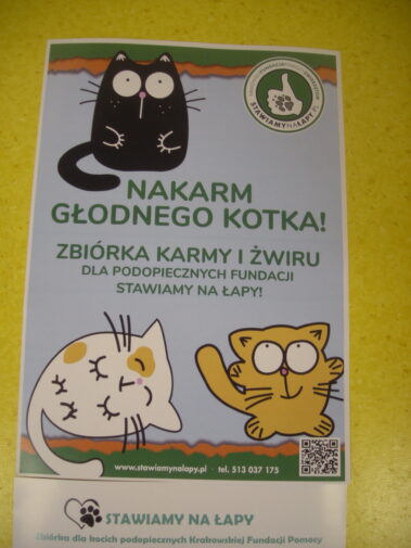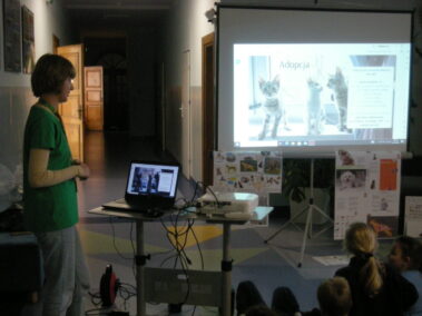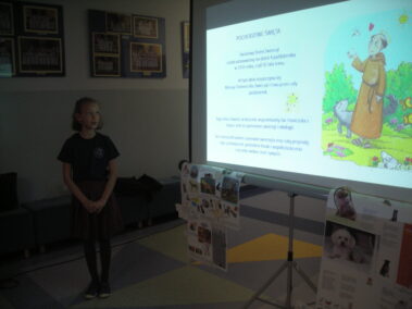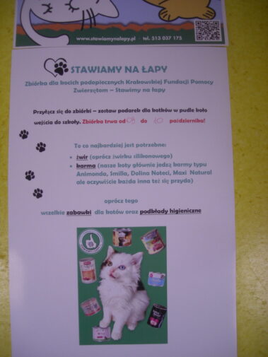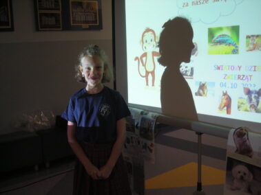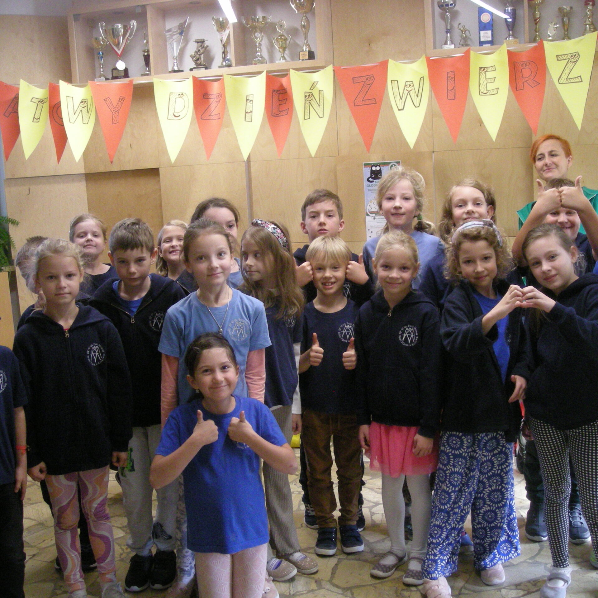 4 października obchodzony jest „Światowy Dzień Zwierząt” w dzień patrona zwierząt – św. Franciszka z Asyżu. Od tego dnia rozpoczyna się Tydzień Zwierząt, trwający do 10 października. W naszej szkole również obchodziliśmy to święto, którego pomysłodawcami byli uczniowie z klasy II. W ramach działań uczniowie klas I-III przygotowali plakaty na temat wybranego zwierzątka oraz zrobili selfie ze swoim pupilem. Dzieci wykazały się wielką kreatywnością i odpowiedzialnością w powierzonych zadaniach. Podsumowaniem obchodów było spotkanie na szkolnym korytarzu. Uczennice z klasy II Marysia i Marianka przygotowały prezentacje multimedialne, które przybliżyły tematykę świata zwierząt. Dzieci miały także możliwość zaprezentowania zdjęć swoich pupili. Gościem honorowym spotkania była wolontariuszka z Fundacji „Stawiamy na Łapy”, działająca na rzecz bezdomnych kotów. Wolontariuszka opowiadała o swojej pracy, o domach tymczasowych dla zwierząt i adopcji zwierzaków. Dzieci chętnie opowiadały o swoich domowych pupilach i chciały dowiedzieć się, co trzeba zrobić, kiedy widzimy bezpańskiego kota w swojej okolicy. Spotkanie jeszcze bardziej uwrażliwiło uczestników spotkania na krzywdę zwierząt. Uświadomiło także, że w pomoc zwierzętom mogą zaangażować się nawet najmłodsze dzieci. W ramach obchodów tego święta została zorganizowana również zbiórka karmy i żwiru dla podopiecznych Fundacji „Stawiamy na Łapy”. Zebrane rzeczy zostały przekazane przedstawicielowi Fundacji.