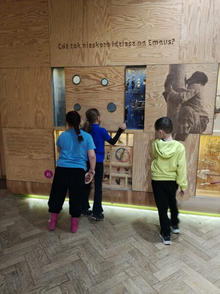W dniu 26 marca uczniowie klasy drugiej, mimo deszczowej aury, byli w doskonałych nastrojach. Tego dnia odwiedzili muzeum etnograficzne, gdzie uczestniczyli w warsztatach pt. „Wielkanoc. Czas odnowy”, gdzie poznawali świąteczne zwyczaje na tle budzącej się do życia przyrody. Podczas zajęć dowiedzieli się z czego składała się palma wielkanocna i jakie znaczenie miały jej elementy oraz jak składać życzenia za pomocą pisanek. Warsztaty wprowadziły ich w czas świątecznych przygotowań oraz przybliżyły zarówno chrześcijańskie, jak i przedchrześcijańskie źródła polskich tradycji wielkanocnych. Na zakończenie dzieci wykonały trójwymiarowe kartki z motywem drzewka emausowego.