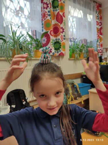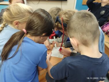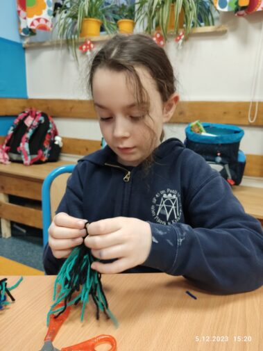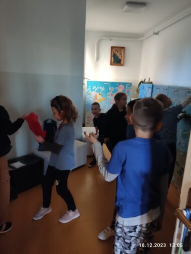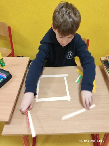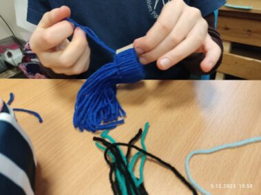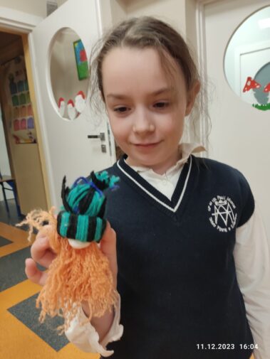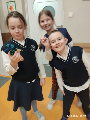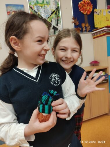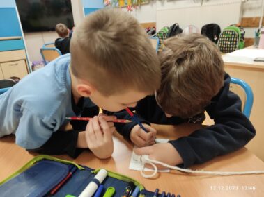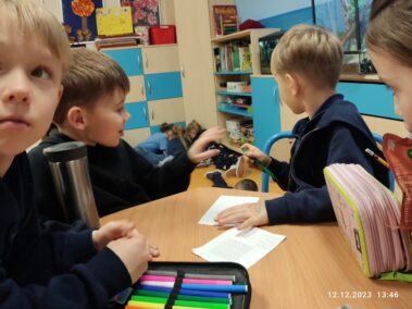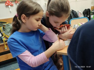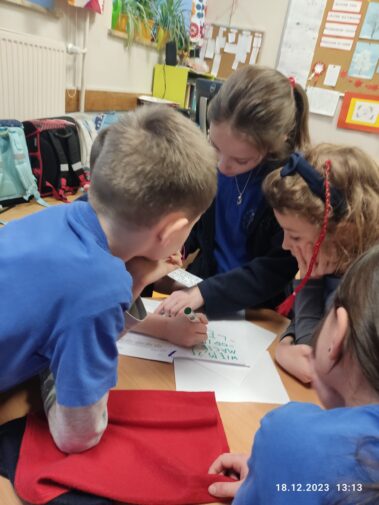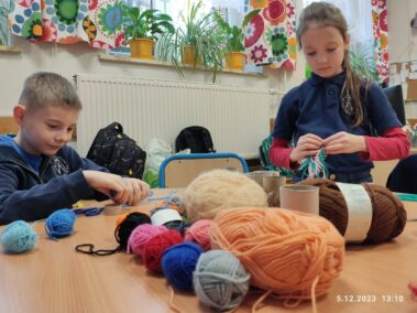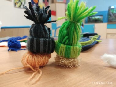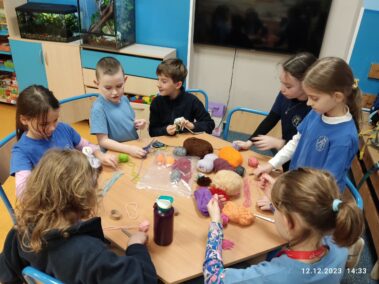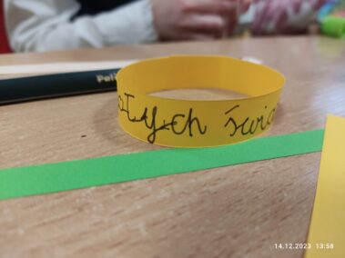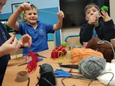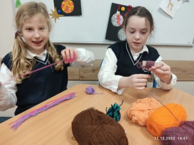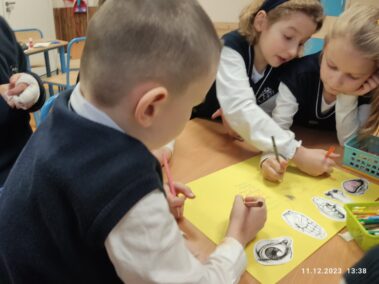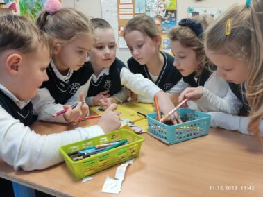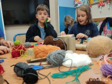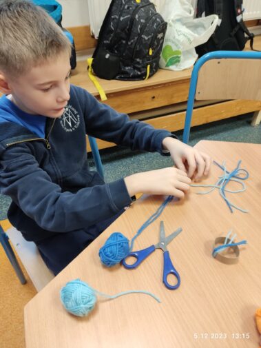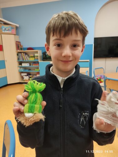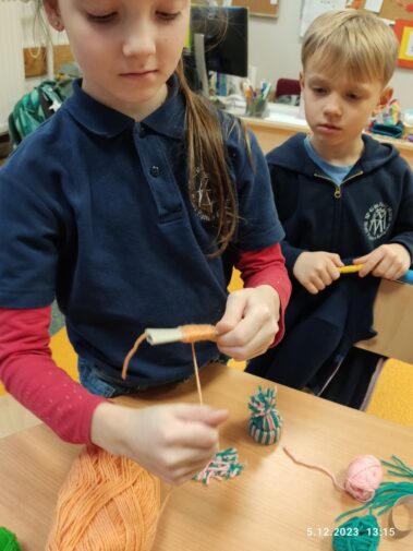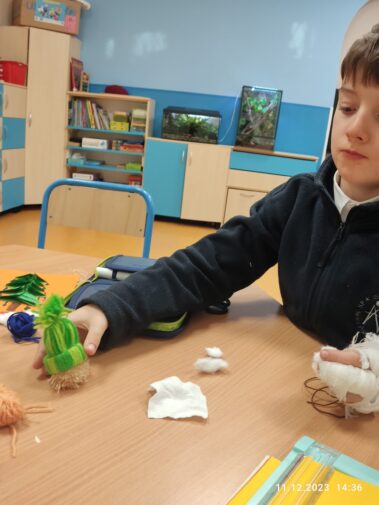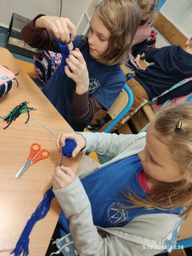 W pierwszym tygodniu grudnia dzieci pisały listy do Świętego Mikołaja, w których przedstawiły swoje świąteczne marzenia i prośby. Próbowaliśmy wymyślić życzenia i tworzyliśmy piękne kartki świąteczne. Następnie dzieciaki własnoręcznie tworzyły skrzaty z włóczki. To zadanie wykonywali z nam również chętni uczniowie z klasy I i III. Kto pamiętał o zadaniach na weekendy, starał się uśmiechać do wszystkich spotkanych osób, spełnić dobry uczynek oraz przyglądnąć się dokładnie wieńcowi adwentowemu we własnym kościele.