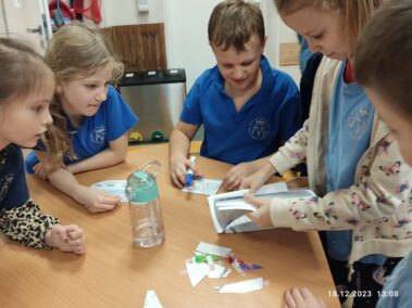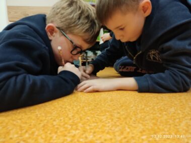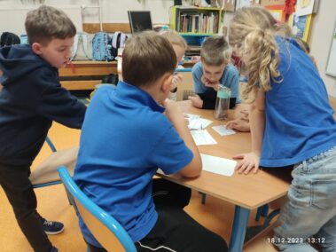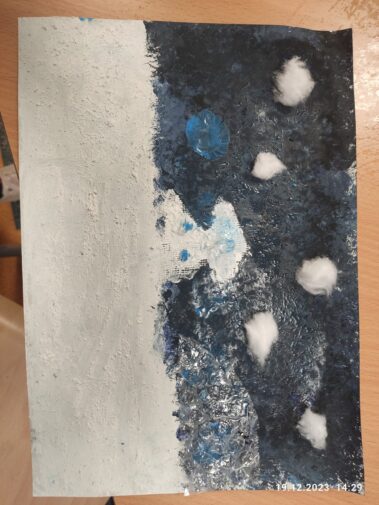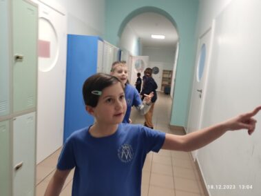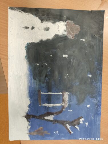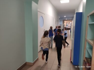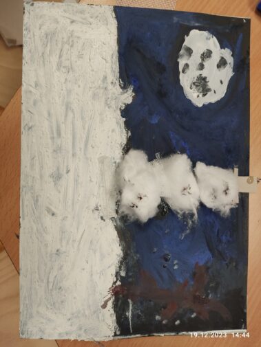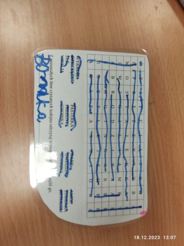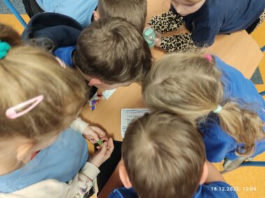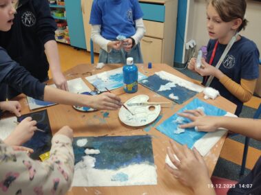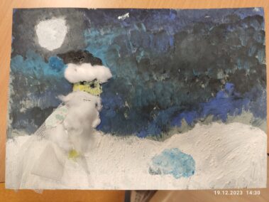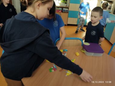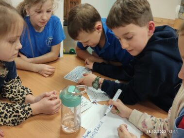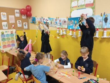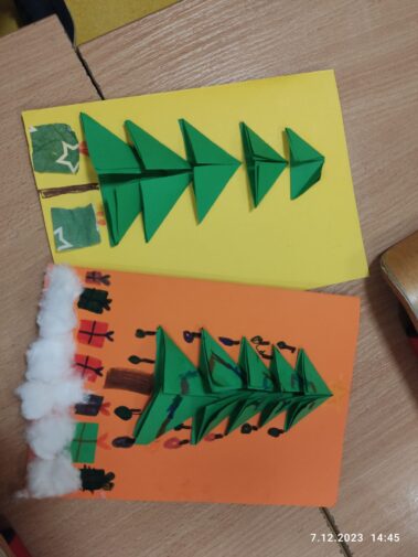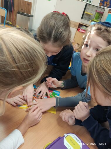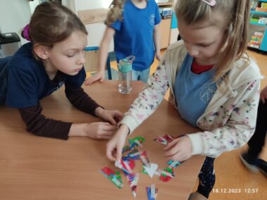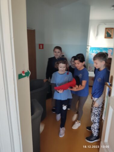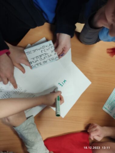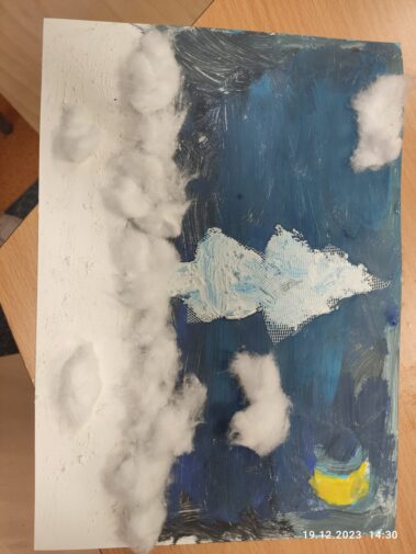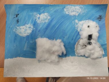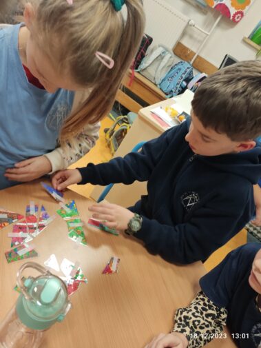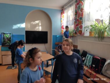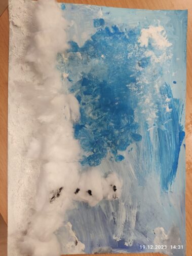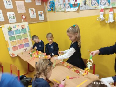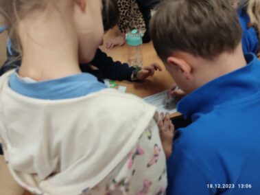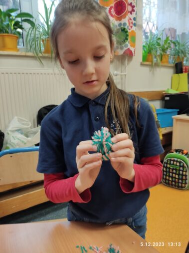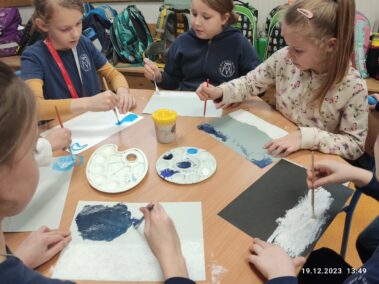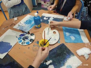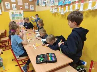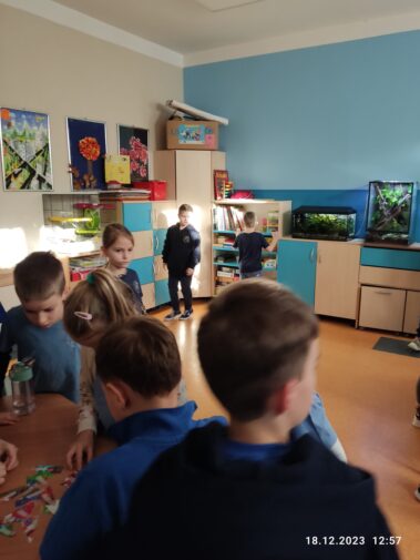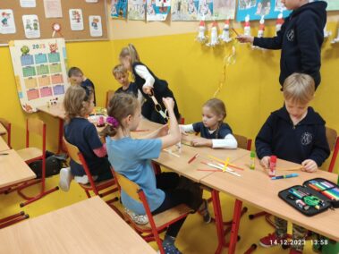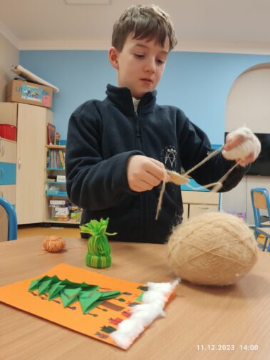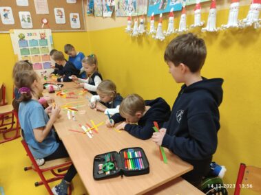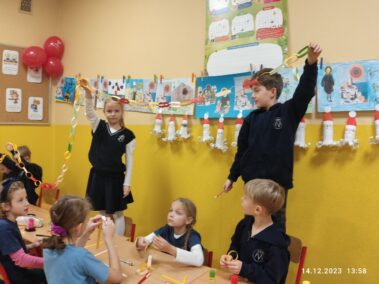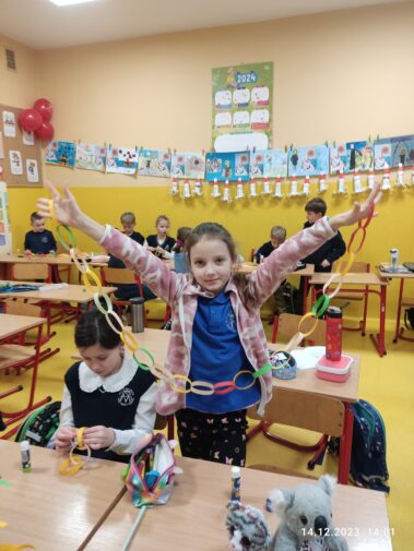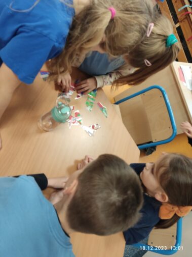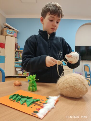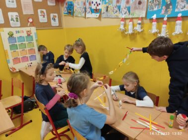 W ostatnim tygodniu adwentu dzieciaki grały w terenową grę świąteczną. W grupach musiały odnaleźć elementy układanki i odszyfrowywać wskazówki, aby dowiedzieć się jaką wiadomość, chce im przekazać wychowawczyni. Zabawa wywołała wiele śmiechu i emocji. Wszyscy uczestnicy spisali się na medal. W kolejnych dniach uczniowie tworzyli śnieżne obrazki, malując farbą z proszkiem do prania oraz papierowe ozdoby. Na koniec przy dźwiękach wesołych świątecznych melodii oraz kolęd dzieciaki stworzyły małe choineczki z papieru, a właściwie cały las choinek.