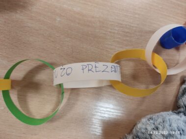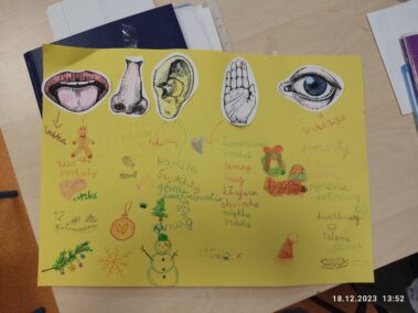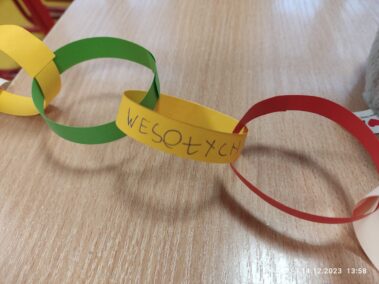 W drugim tygodniu zastanawialiśmy się, jak czujemy święta. Rozmyślaliśmy nad każdym naszym zmysłem. Dzieciaki dotykały różnych przedmiotów, związanych ze świętami, o zróżnicowanych fakturach (gałązka choinki, lód, brokatowa bombka) oraz określały co widzą. Wąchały przyprawy, których zapach kojarzy się ze świętami (cynamon, goździki, kakao). Na koniec wspólnie stworzyły plakat własnych wrażeń zmysłowych i skojarzeń, na którym znalazły się m.in. smak żurku, zapach ryby, okrzyk Mikołaja ( HO HO HO), kłująca choinka i błyszcząca gwiazda. W kolejnych dniach rozwiązywały zagadki i quizy o tematyce zimowej, rozpakowywały paczuszkę w rytm świątecznej muzyki, za każdym razem odkrywając nazwę tradycji lub zwyczaju związanego ze świętami Bożego Narodzenia. Rozmawiały o znanych i mniej znanych im zwyczajach. Na koniec tygodnia wszyscy wesoło się bawili, tworząc łańcuch życzeń, który okazał się tak długi, że ozdobił dookoła naszą salę świetlicową. Łańcuch mierzył aż 2,70 m. Dzięki czemu w naszej świetlicy zrobiło się bardzo świątecznie. Na weekend dzieci dostały zadanie, by udekorować swój dom, pomoc rodzicom w porządkach świątecznych i porozmawiać z rodzicami lub dziadkami jak wyglądały ich święta, kiedy byli dziećmi.